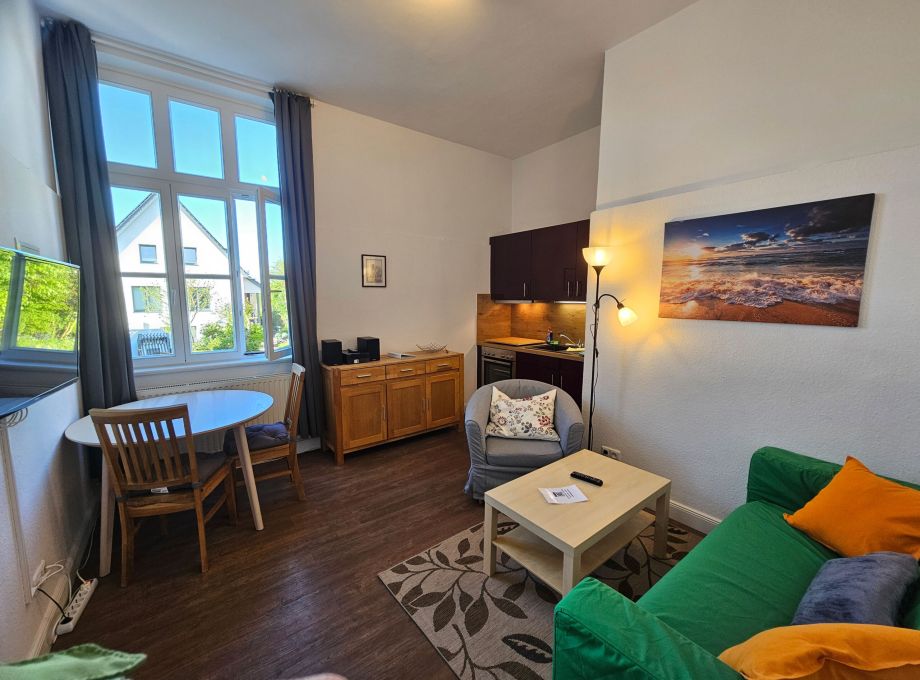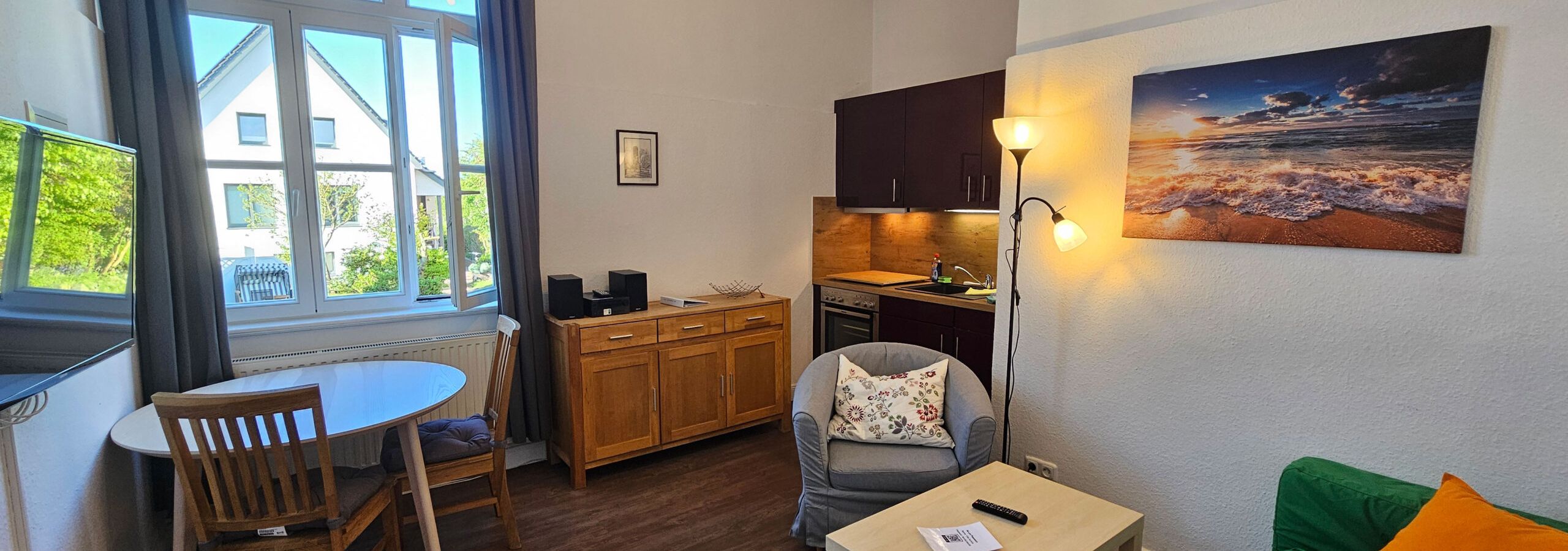 Der Wohnbereich mit voll ausgestatteter Küchenzeile beinhaltet eine Sitzecke, Fernseher mit Sat TV, Radio und WLAN.